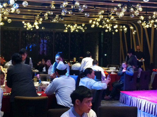 宴会厅张灯结彩, 呈现出一派迎新春、庆佳节的热烈气氛。艾迪机器总经理孙总和艾迪员工共同观看演出并共进晚餐,演出开始前,他积极参与到微信抽奖和摇摇乐等互动环节中来,现场欢歌阵阵、笑语连连,每个人脸上洋溢着欢乐祥和、温暖如春的笑容。